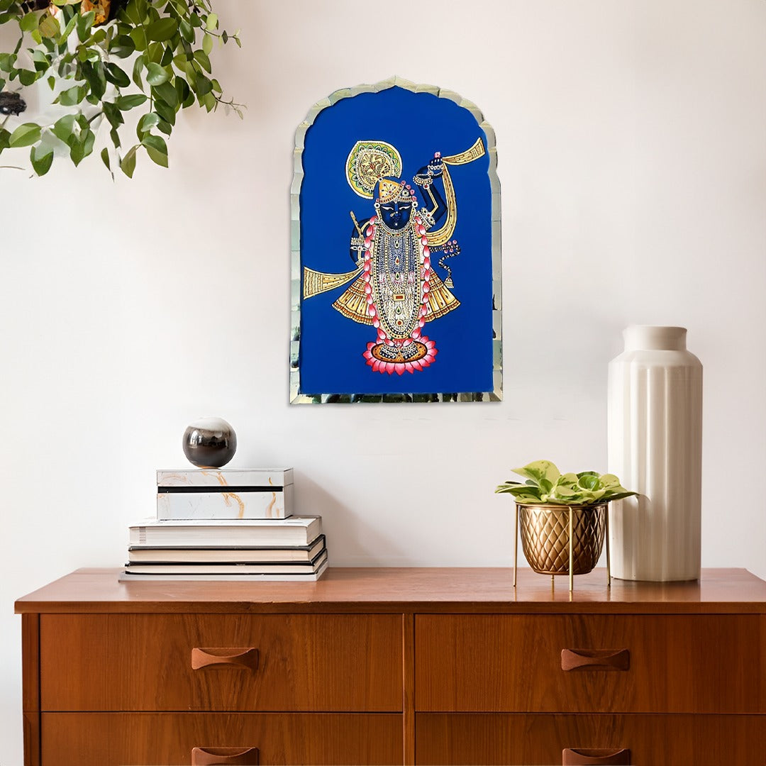 Celebrate the divine presence of Lord Shrinathji with this mesmerizing Thikri artwork. The central piece of the triptych, this artwork features the deity in serene glory, playing his flute against a tranquil blue background. Intricately crafted with mirror inlay detailing, Lord Shrinathji is adorned with a radiant glass-inlay crown and garland, exuding a celestial brilliance. This piece captures the essence of devotion, making it a perfect standalone work or the heart of a larger display.