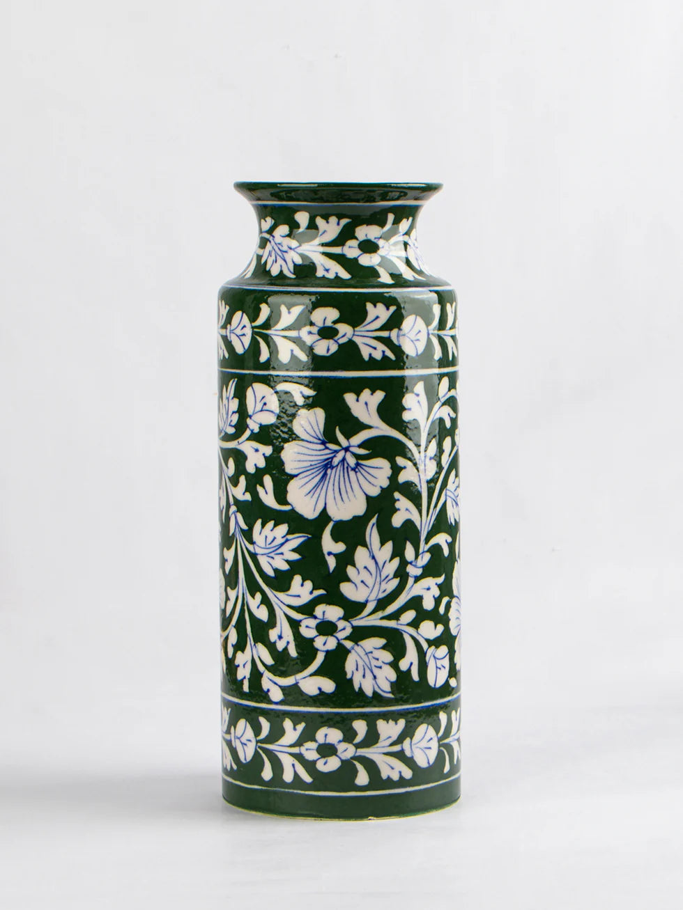 This handcrafted white and blue floral vase is a beautifully crafted piece of pottery art that brings...