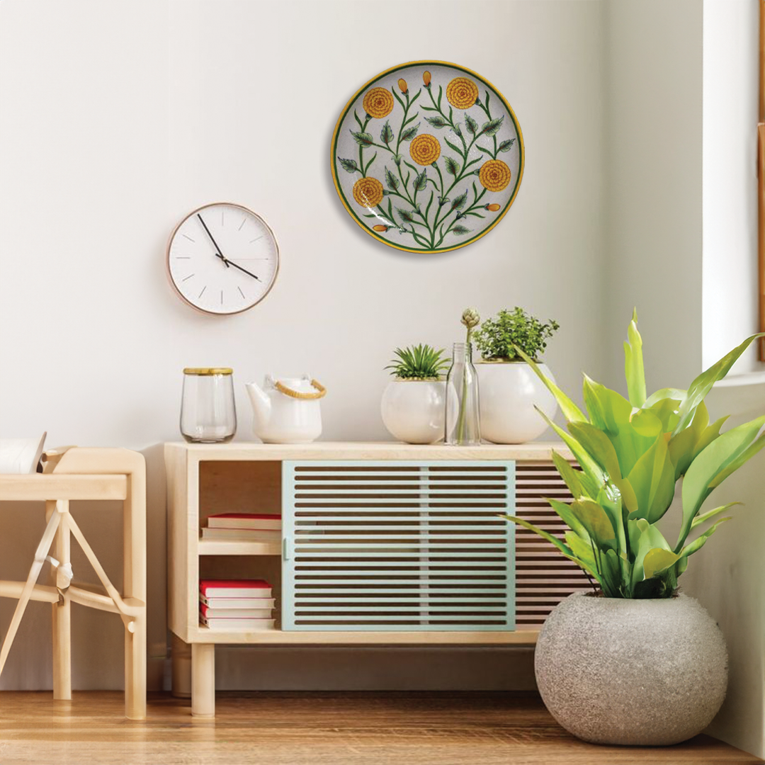 Handcrafted Quartz Stone Powder Jaipur Blue Pottery Decorative Marigold Flower Wall Hanging Plate | 10 Inch | Decorative Wall Plate
