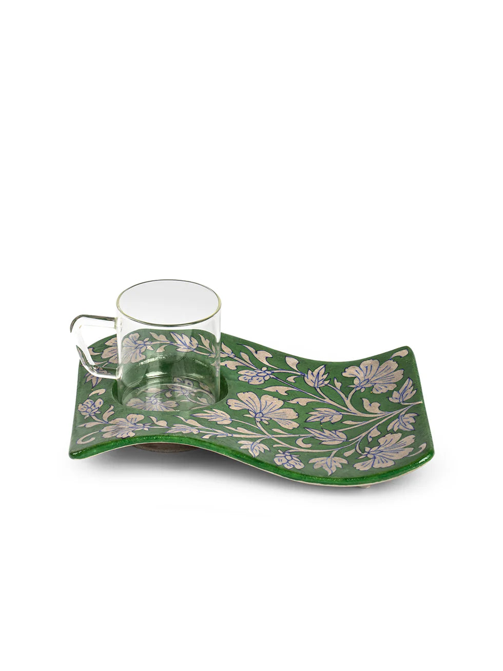 Paired with the tray is a Borosil cup, known for its excellent heat resistance and crystal-clear appearance. The cup harmoniously complements the tray’s elegance, creating a cohesive, visually stunning set ideal for serving tea, coffee, or other beverages.It also makes a thoughtful gift for anyone who appreciates the charm of handcrafted pottery and the functionality of a borosilicate glass cup.