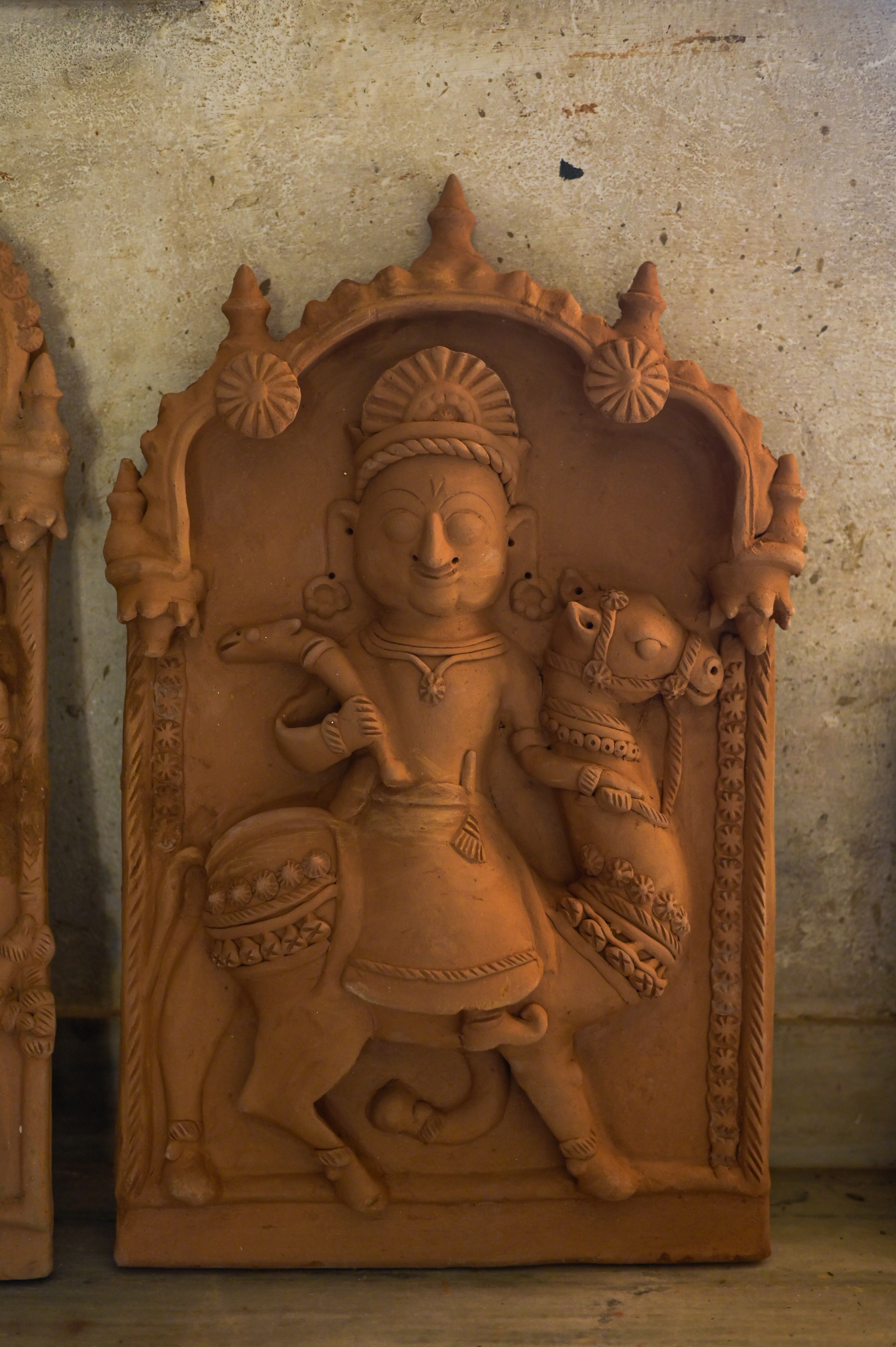 Intricately etched into terracotta, the depiction of Goddess Momai, mounted on a camel, exudes both power and grace. The earthy tones reflect the warmth of the desert, while the intricate motifs and patterns blend tradition with a touch of modern design, paying homage to centuries of Rabari heritage.
