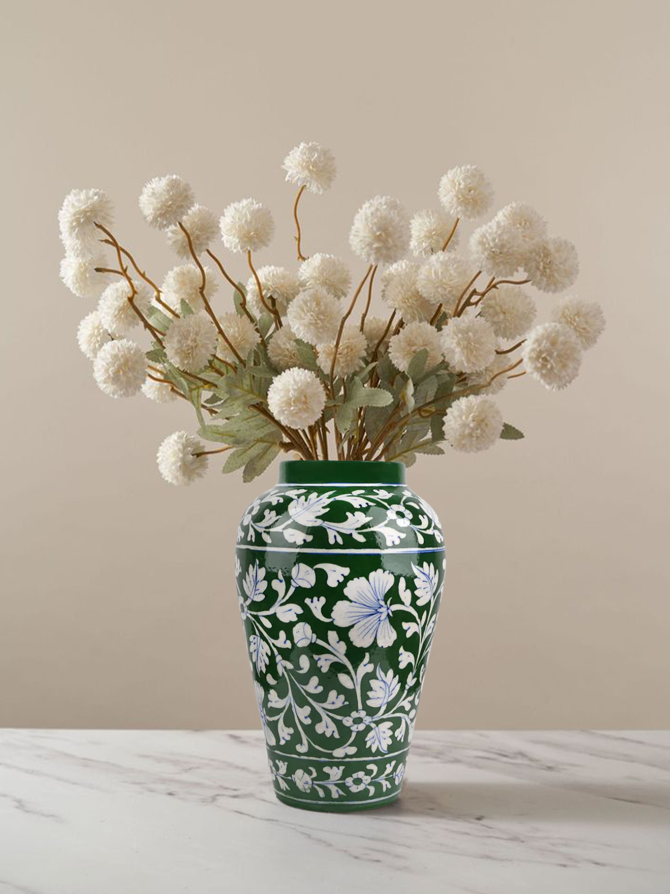 Handmade Blue Pottery Quartz Stone Powder Green Handiya Flower Vase with Floral Design | 10 Inch | Decorative Flower Vase