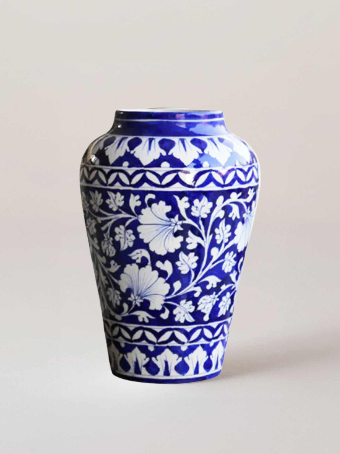 A white and blue pottery floral vase is a beautifully crafted piece of ceramic art, often associated with traditional designs and intricate craftsmanship. The vase typically features a white background adorned with delicate floral motifs in shades of blue, creating a striking contrast.The use of cobalt blue glaze against the white surface gives the vase a timeless elegance, reflecting cultural artistry. Whether used as a decorative item or for displaying flowers, the vase embodies both functionality and aesthetic beauty.
