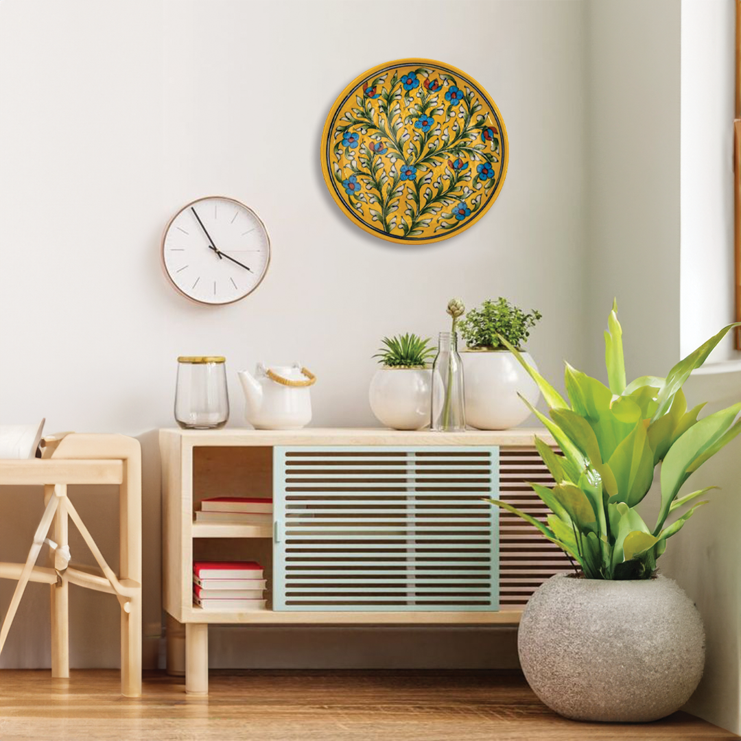 Handmade Quartz Stone Powder 10 Inch Yellow Floral Blue Pottery Decorative Wall Hanging Plate | Decorative Wall Plate