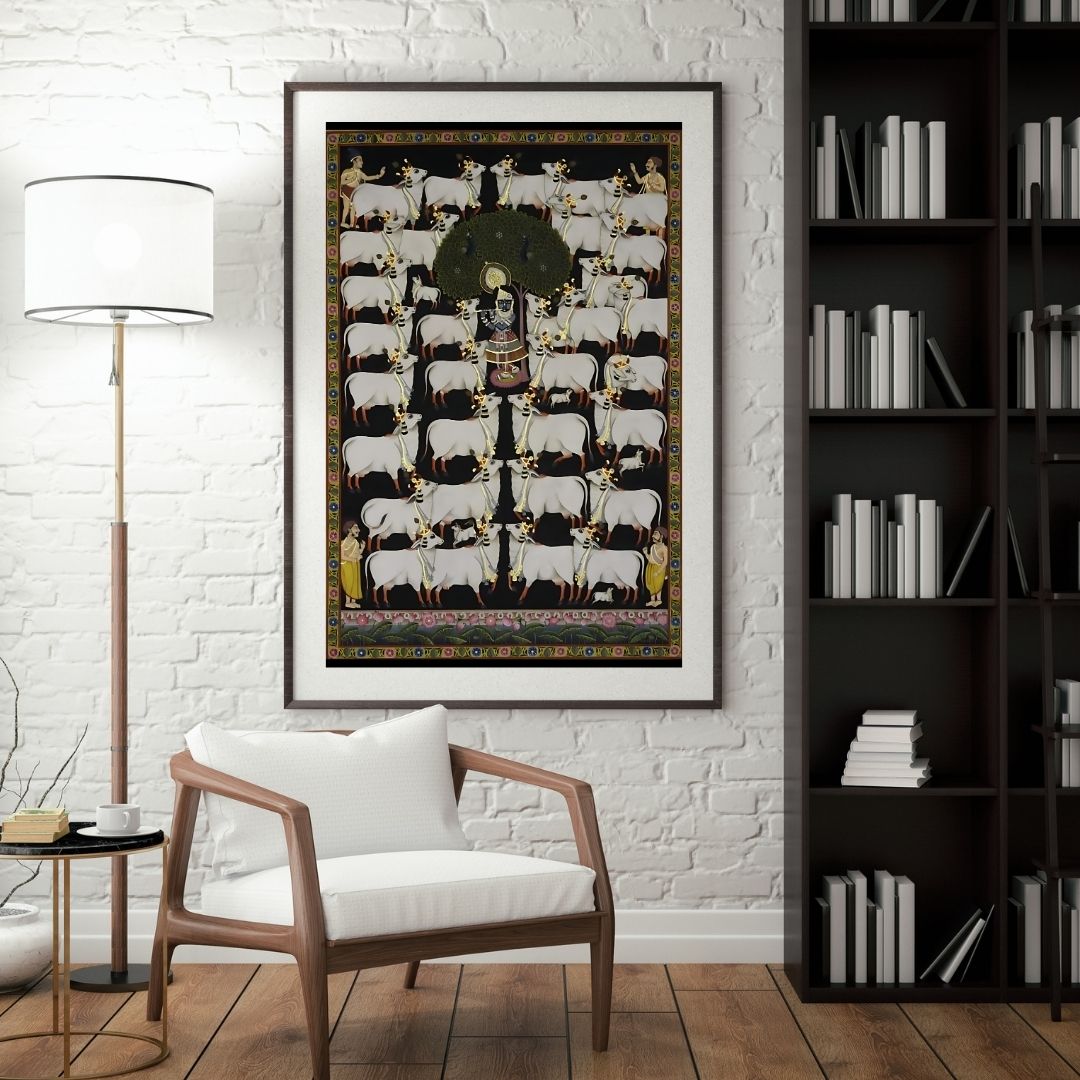 Gopashtami is a heartfelt celebration of the sacred cow, an integral symbol in Pichwai art. This festival marks the day Krishna became a Gauwala or cowherd, emphasizing the deep bond between him and the sacred cattle.