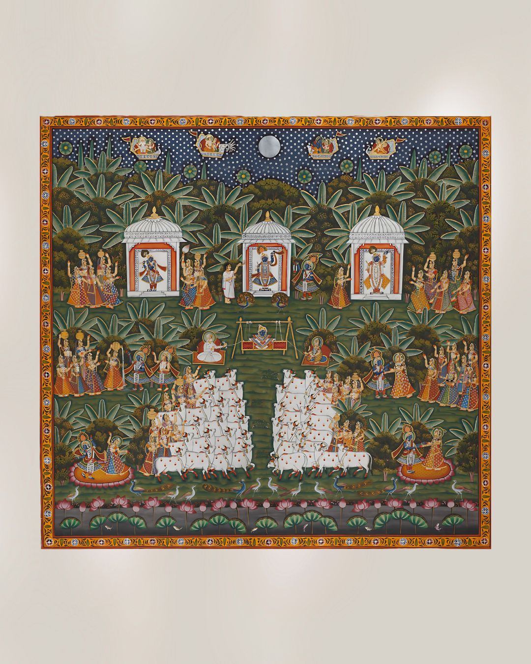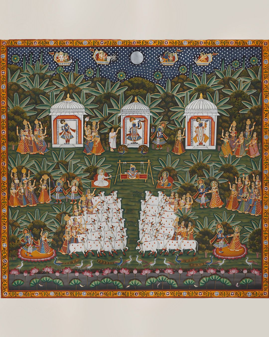 Drawn from the Dasham Skandha of the Bhagavata Purana, Pichwai paintings like this are not just decorative—they are sacred storytelling on cloth.