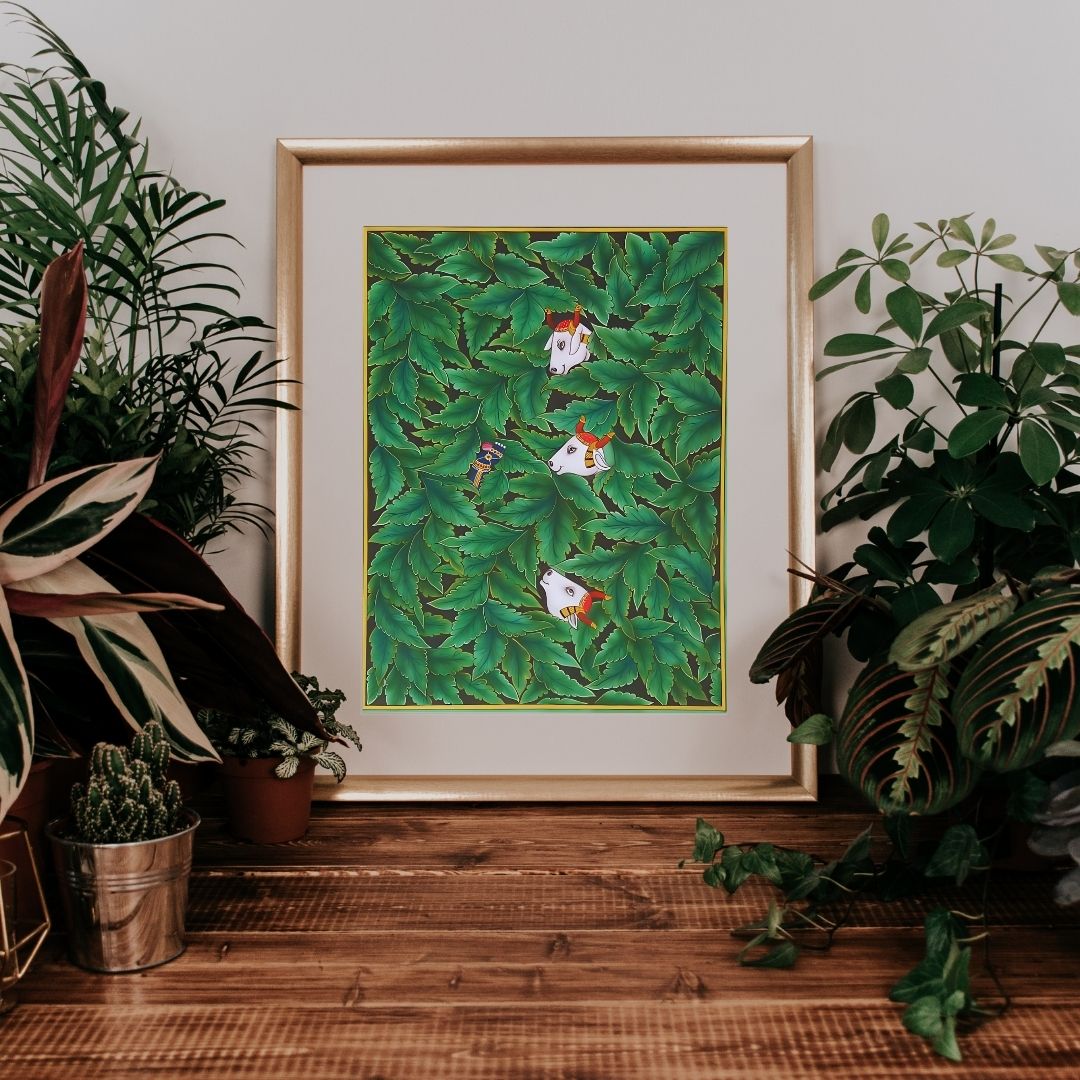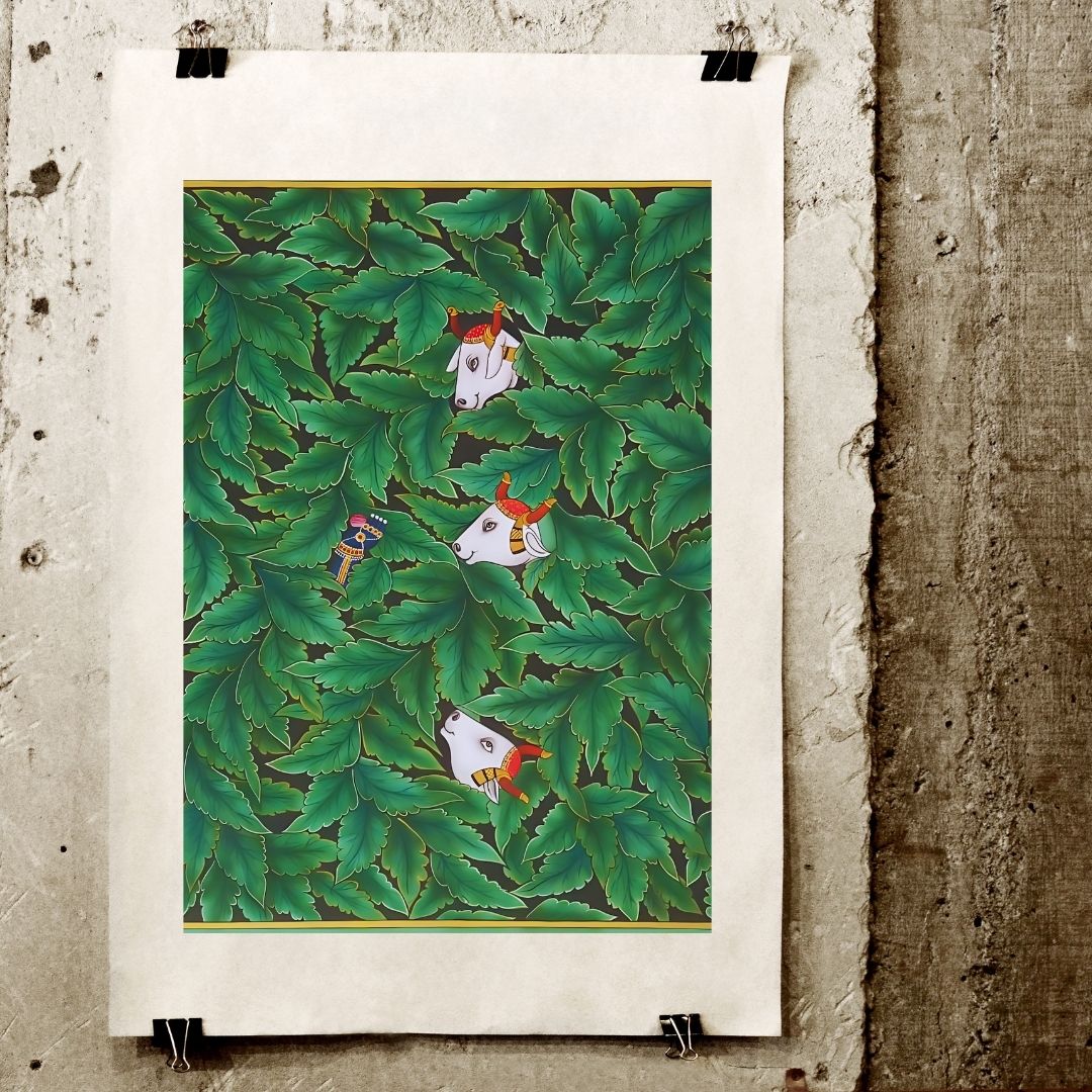 In the background, a tree spreads its branches, possibly symbolizing the shelter of nature and the eternal bond between the earth and the divine. The intricate detailing of the cows, foliage, and the vibrant colors of the scene create a serene and spiritual ambiance, drawing the viewer into the tranquil and devotional mood of the painting.
