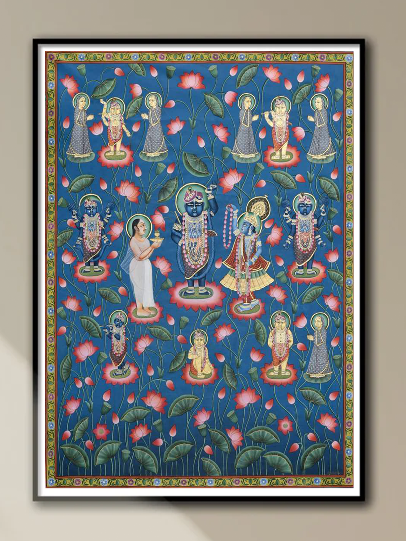 Behold Shrinathji in his seven divine forms, each captured in exquisite detail in Pichwai paintings. These forms highlight unique aspects of Lord Krishna, from his playful childhood to his majestic divinity. The intricate details and vibrant colors in these artworks invite viewers into a realm of spiritual tranquility and divine energy, celebrating the rich cultural heritage of Nathdwara and the timeless legacy of Pichwai art. Let Shrinathji’s blessings fill your heart and home with peace, prosperity, and devotion.