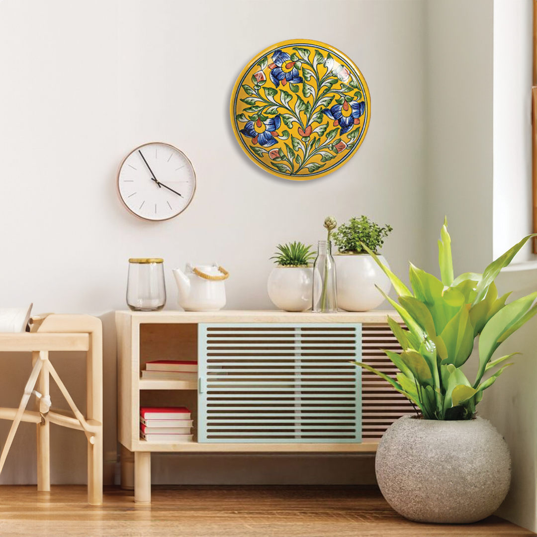 Handpainted Quartz Stone Powder Yellow Floral Blue Pottery 10 Inch Wall Plate | Decorative Wall Plate