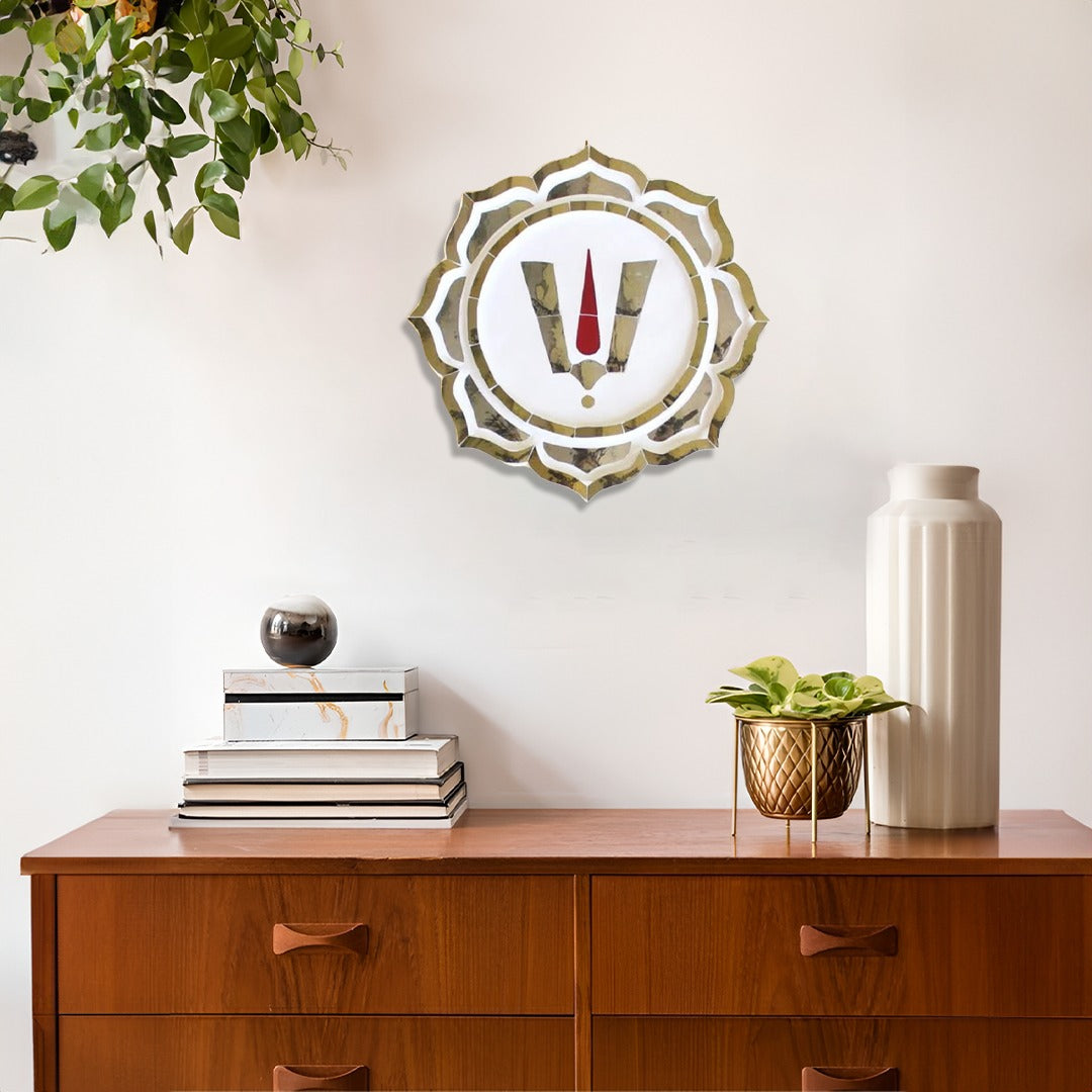 This exquisite set of auspicious symbols, inspired by the sacred Namam of Lord Vishnu, embodies the divine essence of Lord Venkateshwara (Balaji). Crafted in the traditional Rajasthani Thikri art form, these pieces feature intricate mirror inlay work, meticulously handcrafted by skilled artisans.