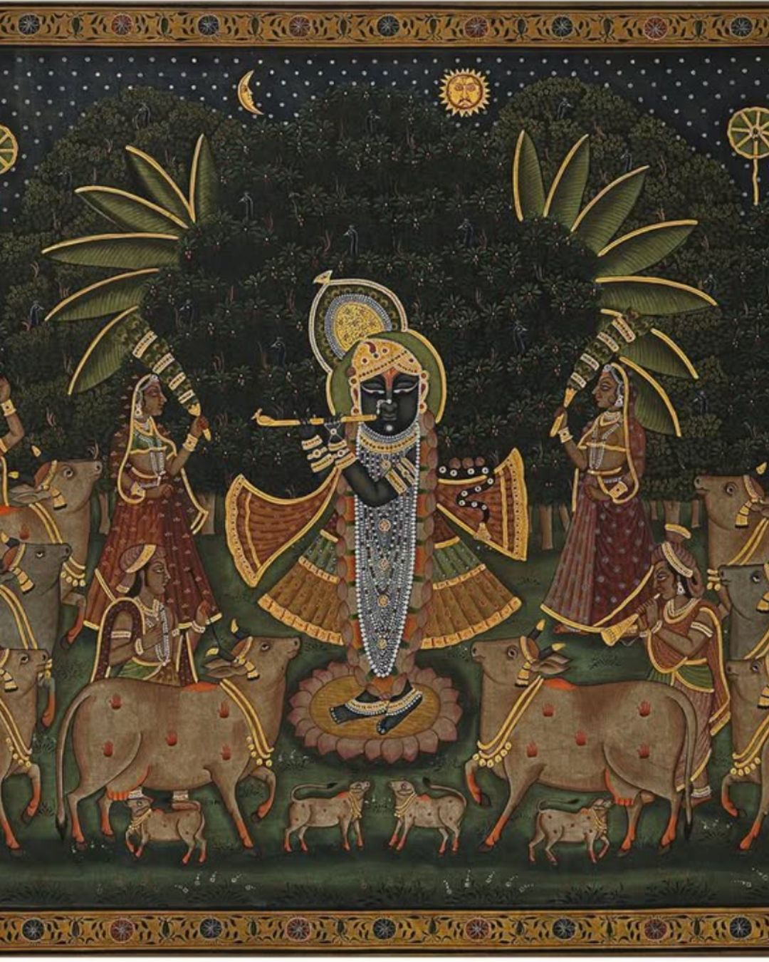 Every detail—the flutter of peacock feathers, the gopis in swirling skirts, and the calm grace of the cows—enhances the atmosphere of divine intimacy between the Lord and his most faithful companions.