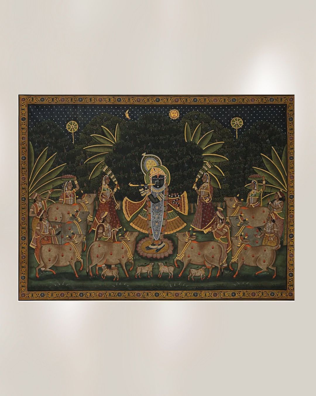 This scene, often celebrated in Pichwai paintings, is more than a pastoral moment—it's a symbol of eternal love, surrender, and spiritual connection. The gopis, with eyes filled with longing and hearts brimming with bhakti, gather to catch a glimpse of their beloved. Cows, considered sacred and deeply cherished by Krishna, stand peacefully nearby—silent witnesses to this celestial exchange.