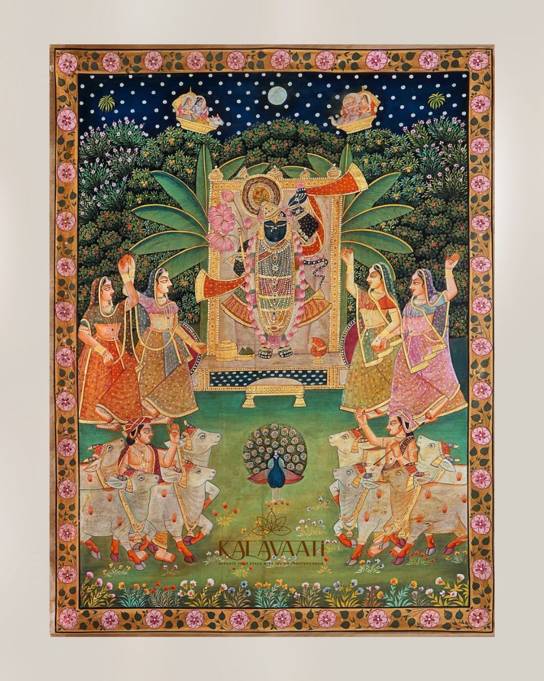 In the serene beauty of Vraj, where devotion blossoms like lotus in rain, Shrinathji—a radiant form of Lord Krishna—grants his divine darshan to the ever-devoted gopis and sacred cows.