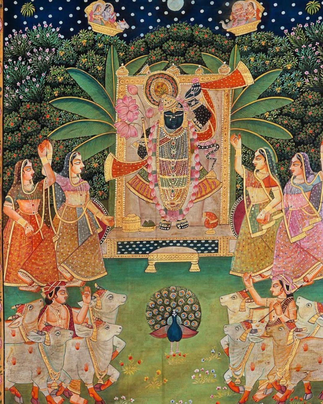 Every detail—the flutter of peacock feathers, the gopis in swirling skirts, and the calm grace of the cows—enhances the atmosphere of divine intimacy between the Lord and his most faithful companions.