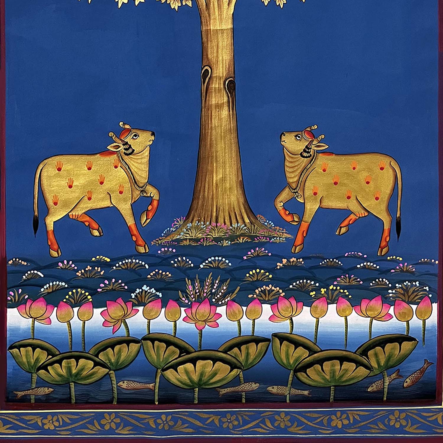 A traditional Pichwai painting gracefully depicts the majestic Tree of Life, beneath which serene cows gather in quiet harmony. Rich in symbolism, this exquisite artwork embodies the essence of creation, the interconnectedness of all living beings, and the eternal cycle of life and death.